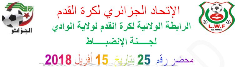 تعلم لجنة الإنضباط بالرابطة الولائية لكرة القدم لولاية الوادي جميع الفرق أنها أصدرت المحضر رقم 25 للاطلاع على المحضر يرجى الضغط على :لنشرة الرسمية لجنة الأنضباط