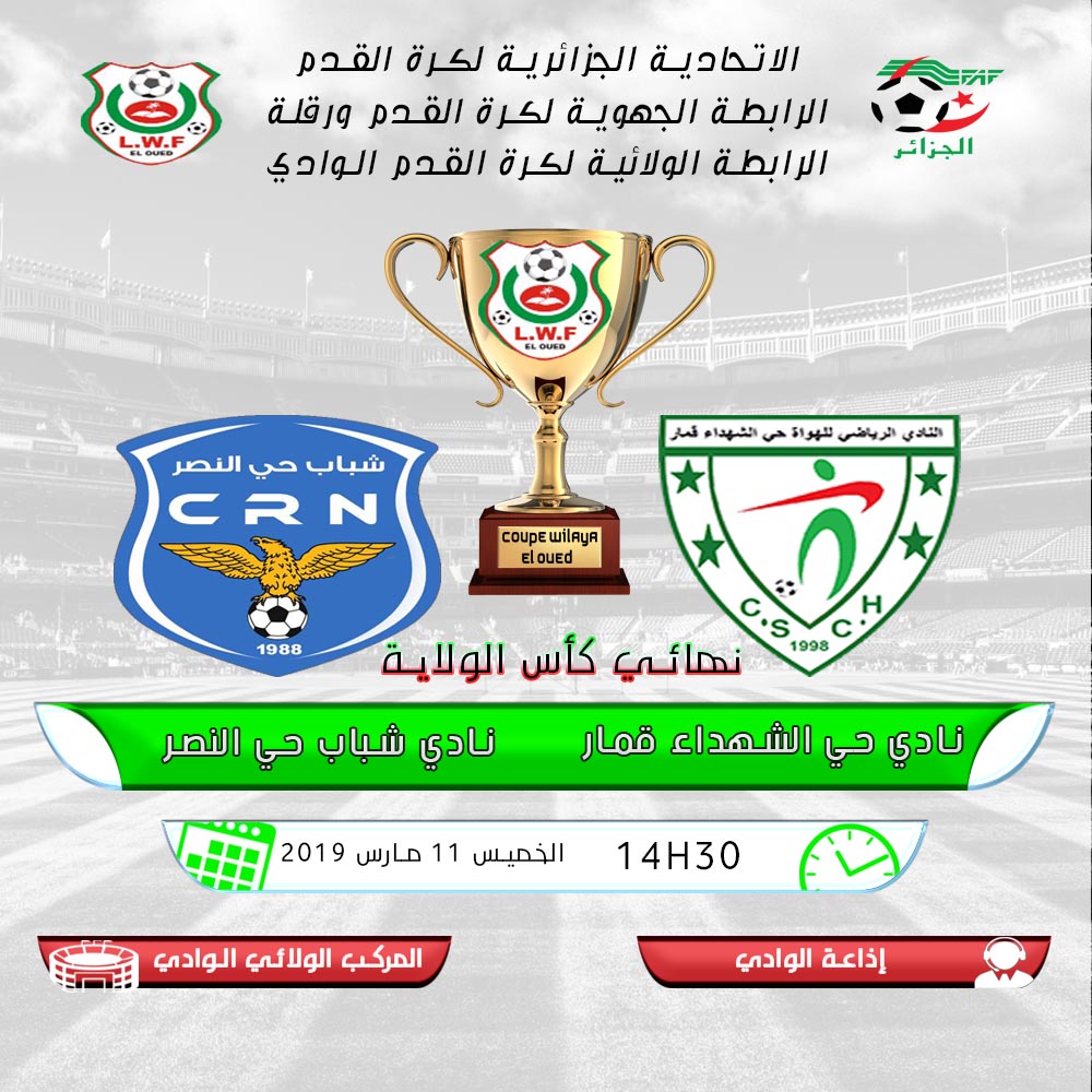 تعلم الرابطة الولائية لكرة القدم الوادي عن تعيينات حكام نهائي كأس الولاية أكابر والذي سيجرى يوم الخميس الموافق لـ 11 / 04 / 2019 على الساعة الثانية والنصف زوالا (14H30) بالمركب الولائي بالشط.