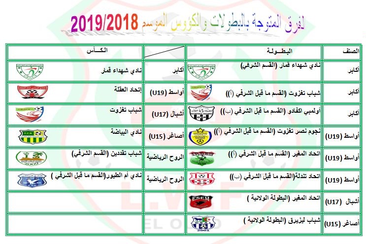 الفرق المتوجة بالبطولات والكؤوس الموسم 2019/2018