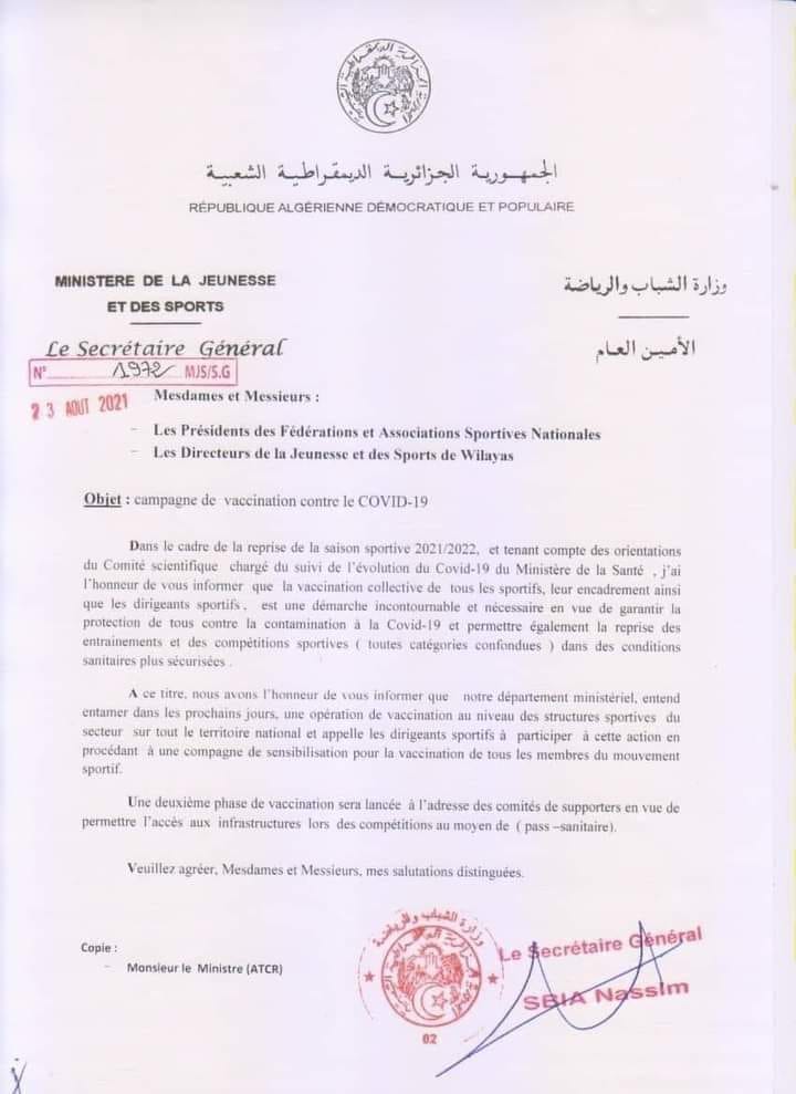 تبعا لمراسلة وزارة الشباب والرياضة نعلم جميع الجمعيات والنوادي و الرياضيين (الحكام - اللاعبين كل الأصناف - الاداريين - الفنيين) على ضرورة التلقيح ضد فيروس كورونا بداية الانخراط في الموسم الرياضي 2021-2022.