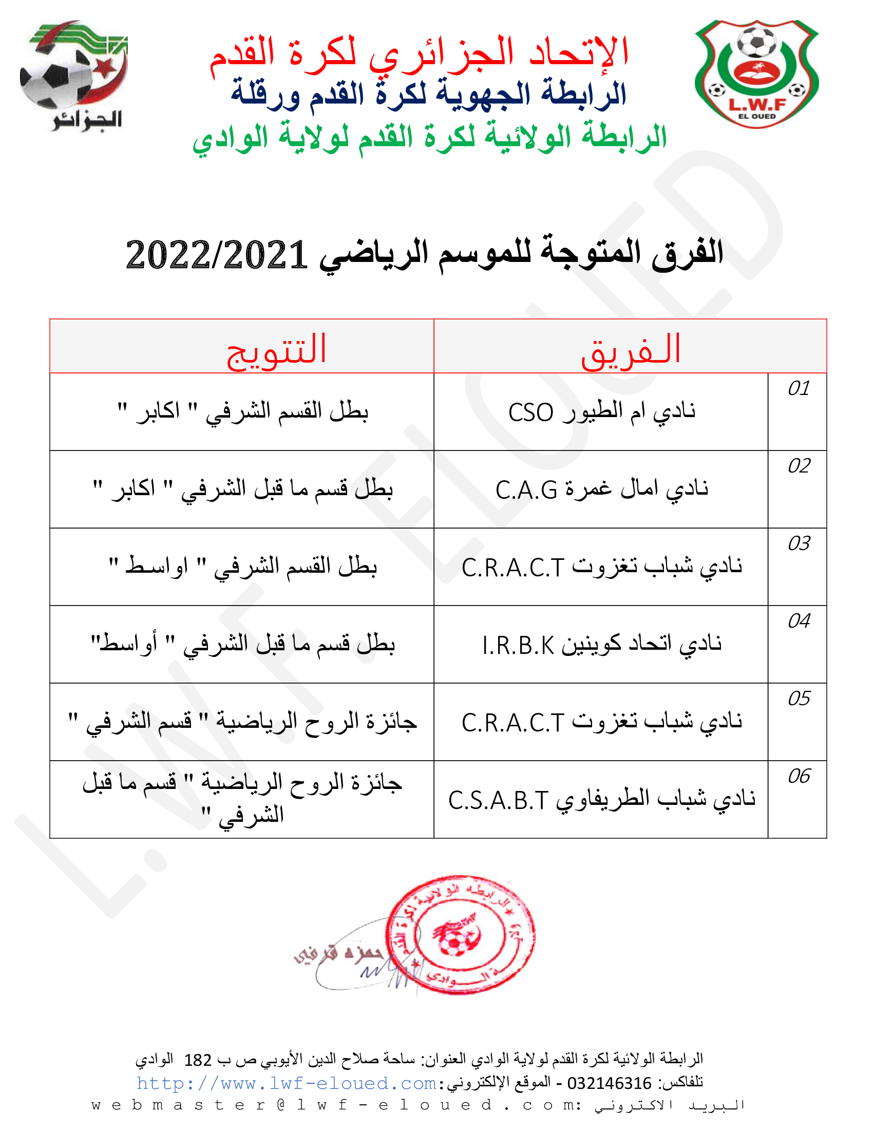 تشكر الرابطة الولائية لكرة القدم كافة النوادي على الالتزام و التعاون و التفهم الكبير و هذا من اجل انجاح الموسم الرياضي 2021/2022 كما تهنئ الفرق المتوجة لهذا الموسم بمحتلف البطولات