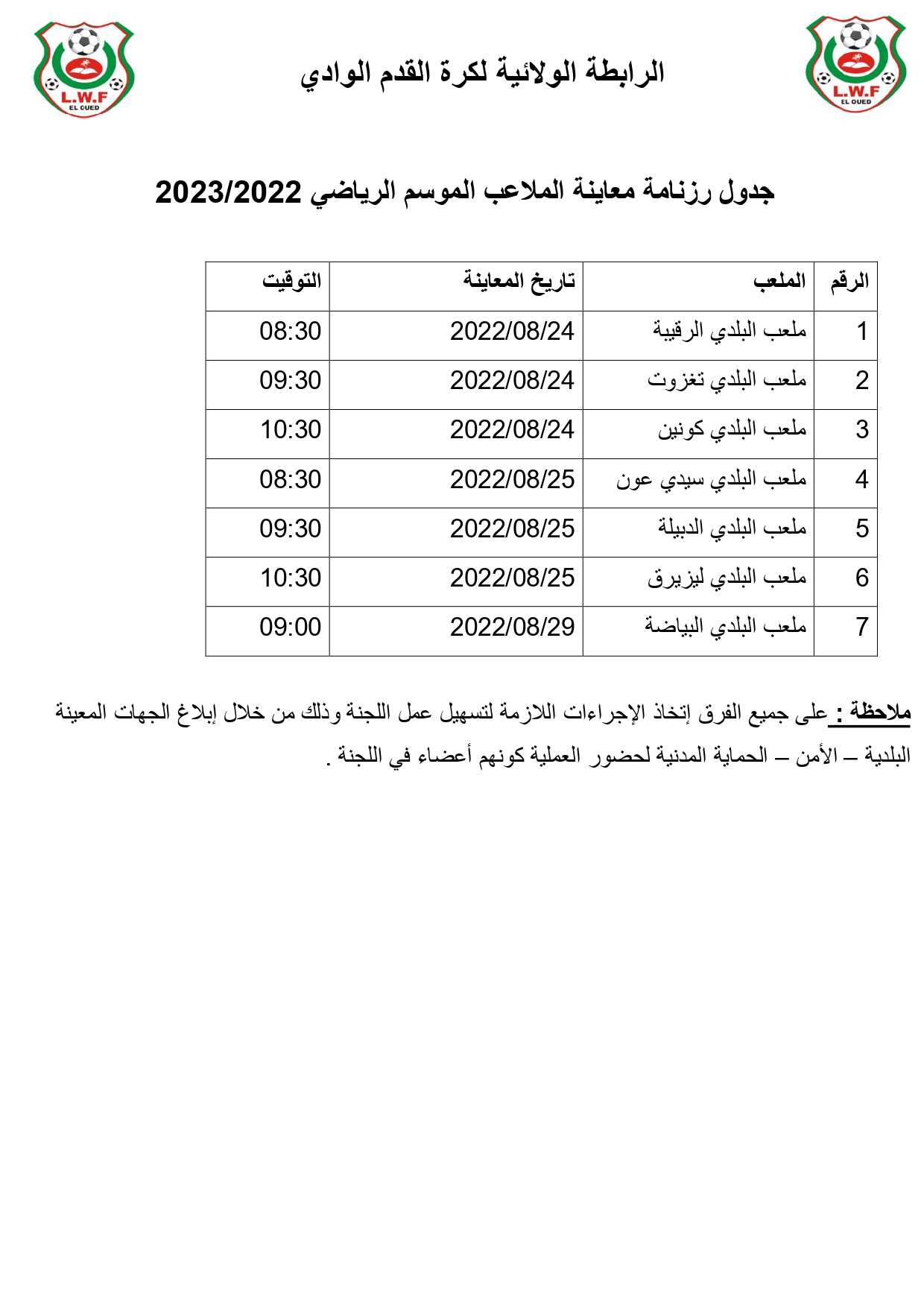 جدول رزنامة معاينة الملاعب