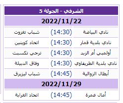 تعلن لجنة المنافسة عن برمجة مقابلات بطولة قسم الشرفي لفئة الأكابر من الجولة الخامسة والتي تجري يوم الثلاثاء 22 نوفمبر 2022 .