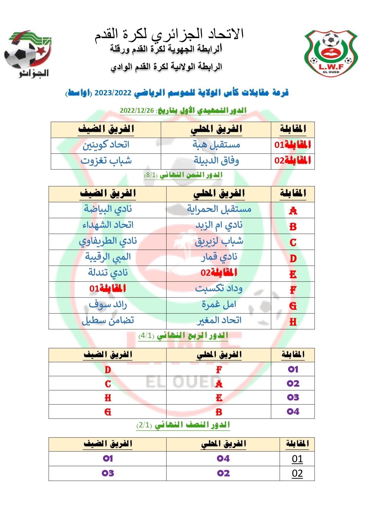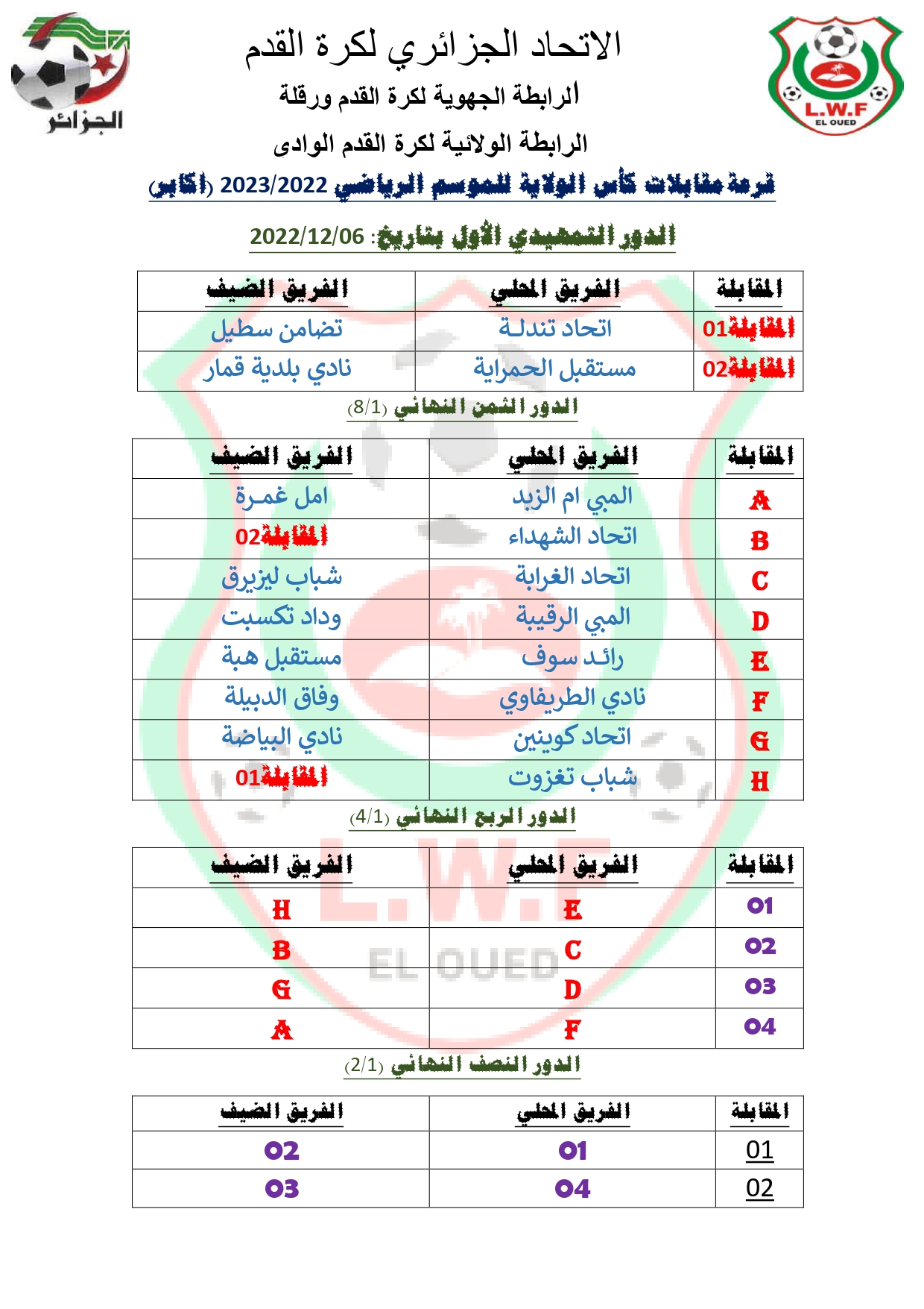 على هامش اجتماع مكتب الرابطة الولائية لكرة القدم المنعقد يوم الخميس الموافق لـــ 2022/11/17 اقيمت هذا المساء بمقر الرابطة قرعة كأس الولاية صنفي الاكابر و الاواسط واسفرت على المواجهات التالية :