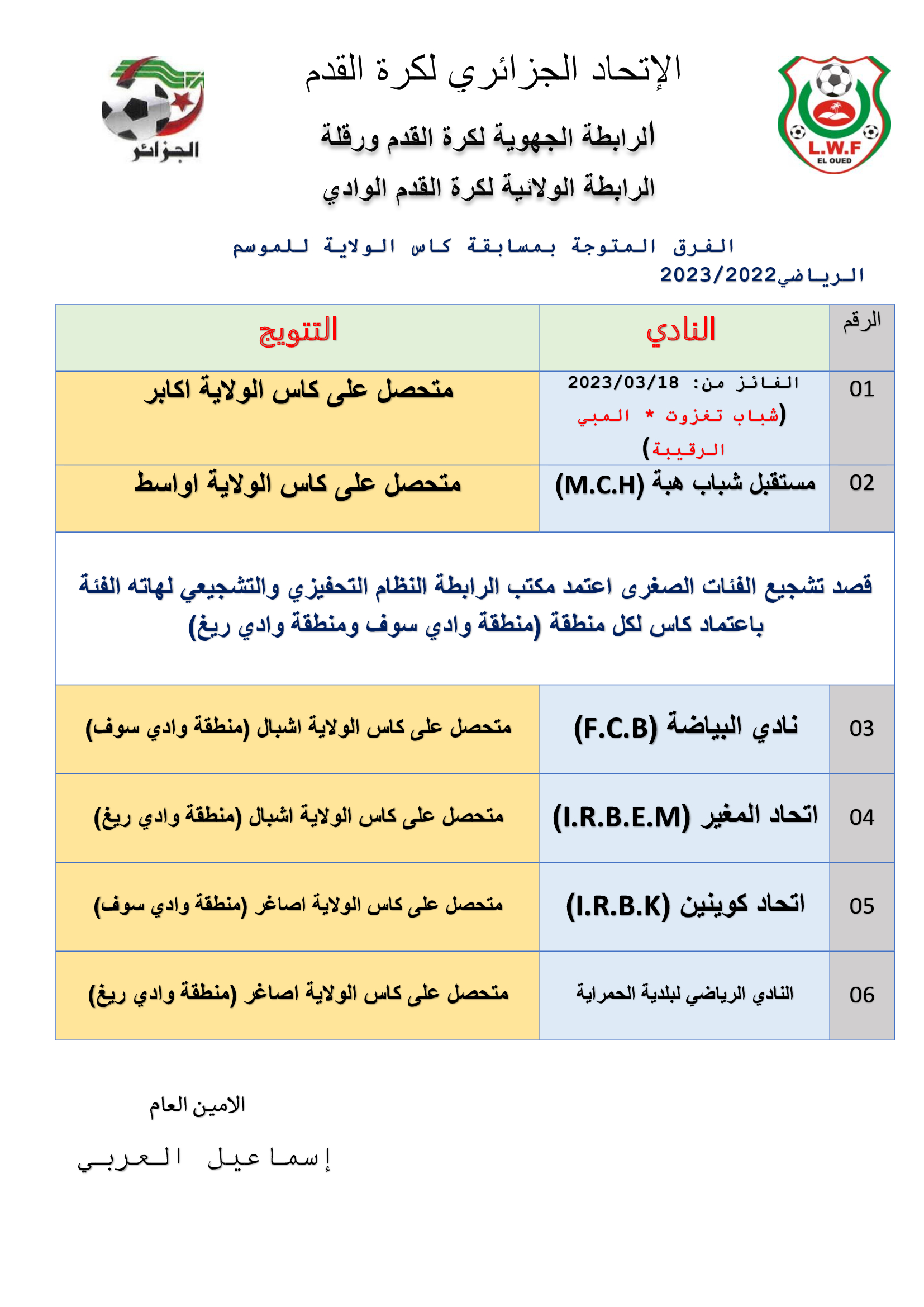 بعد اجتماع مكتب الرابطة المنعقد يوم الاحد الموافق ل2023/03/12 بمقرالرابطة والذي اقر مايلي :