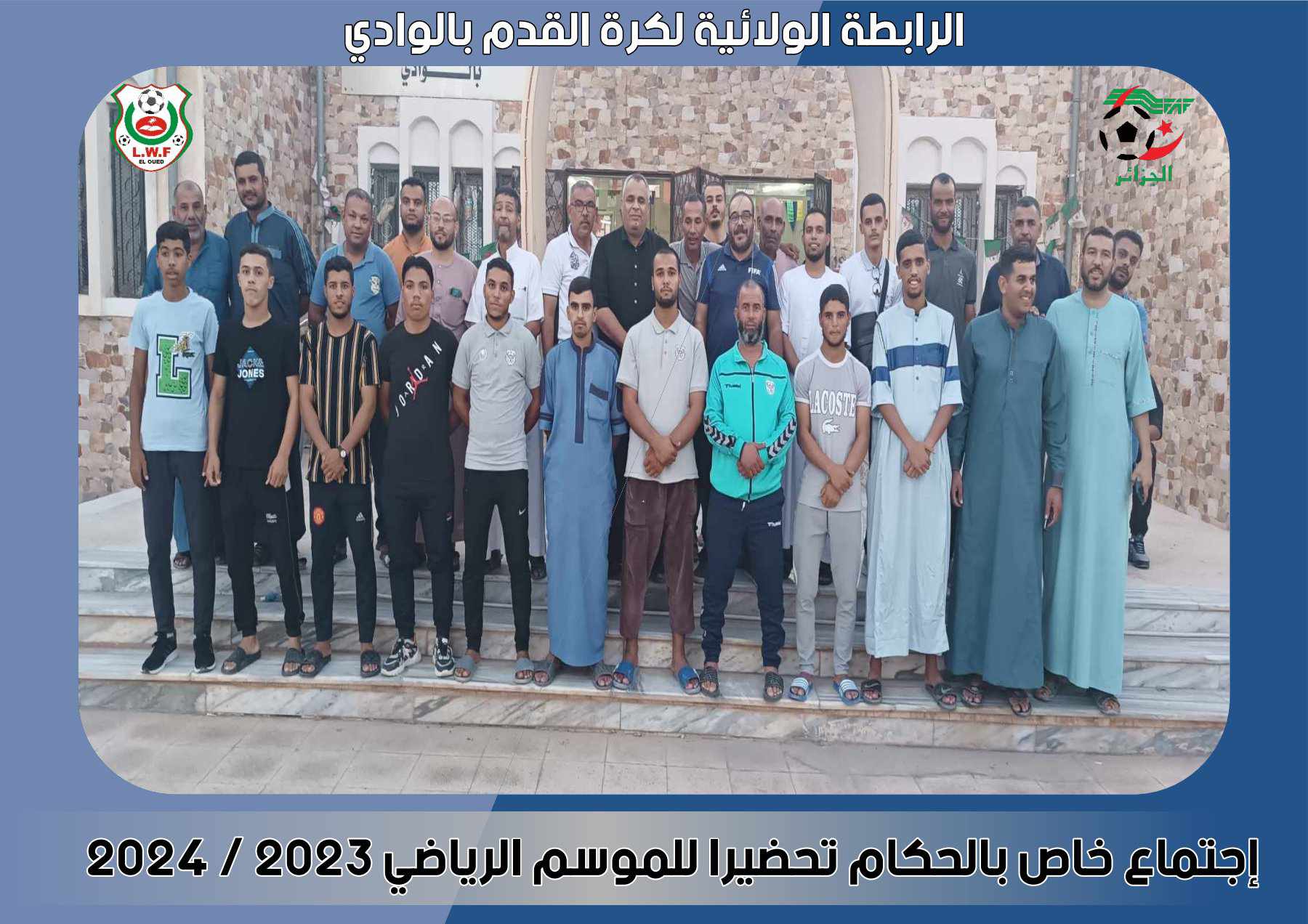 أجرى مكتب الرابطة الولائية لكرة القدم بالوادي والمتمثل في رئيس الرابطة والأمين العام ورئيس لجنة التحكيم إجتماعا بالحكام على مختلف رتبهم وهذا تحضيرا للموسم الرياضي 2023 / 2024 بـدار الشباب حي 300 سكن بالوادي يوم 10 أكتوبر 2023 على الساعة الرابعة مساءا.