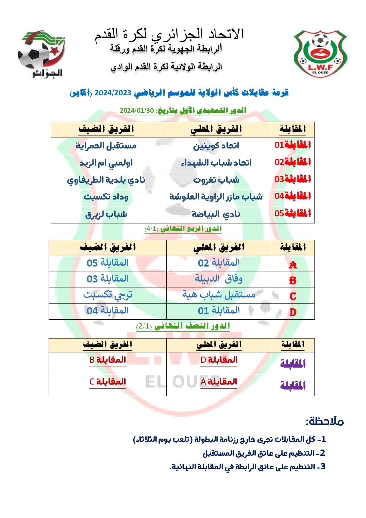 على هامش اجتماع مكتب الرابطة الولائية لكرة القدم المنعقد يوم الثلاثاء الموافق لـــ 2024/01/09 اقيمت هذا المساء بمقر الرابطة قرعة كأس الولاية صنف الاكابر واسفرت على المواجهات التالية :