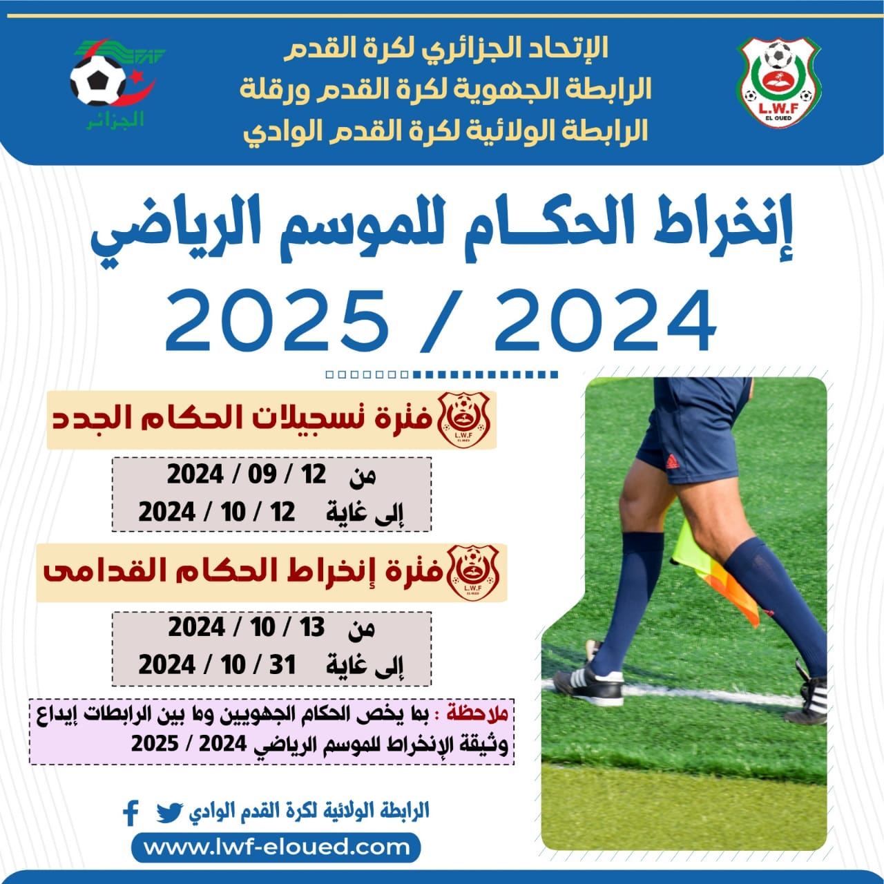 تعلن لجنة التحكيم للرابطة الولائية لكرة القدم بالوادي عن افتتاح باب الانخراط والتجديد في سلك التحكيم فعلى الراغبين في دخول سلك التحكيم التقدم الى مقر الرابطة الولائية لكرة القدم للقيام بعملية الانخراط كما تنهي اللجنة إلى علم كافة الحكام القدامى ، بأنهم مطالبون بإيداع ملفات انخراطهم الخاصة بالموسم الكروي (2024 /2025) لدى الأمانة العامة للرابطة مصحوبين بالوثائق التالية: