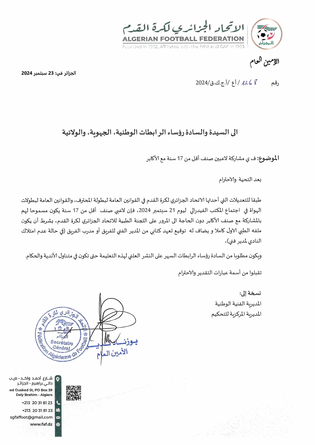 | مراسلة بخصوص مشاركة لاعبي صنف أقل من 17 سنة مع الأكابر. |