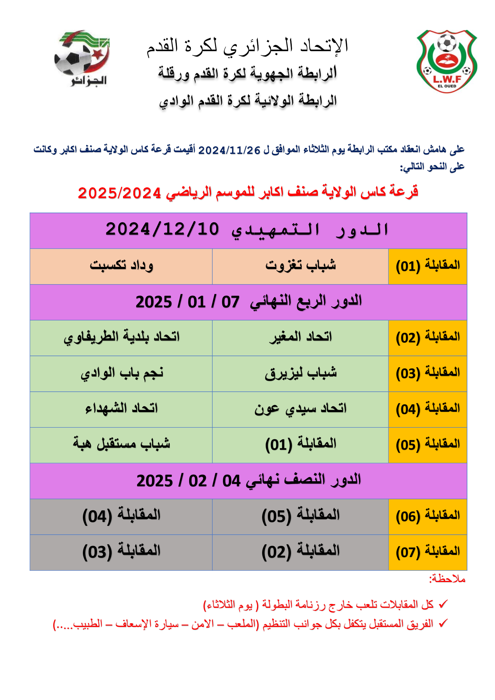 على هامش انعقاد مكتب الرابطة يوم الثلاثاء الموافق ل 2024/11/26 أقيمت قرعة كاس الولاية صنف اكابر وكانت على النحو التالي: