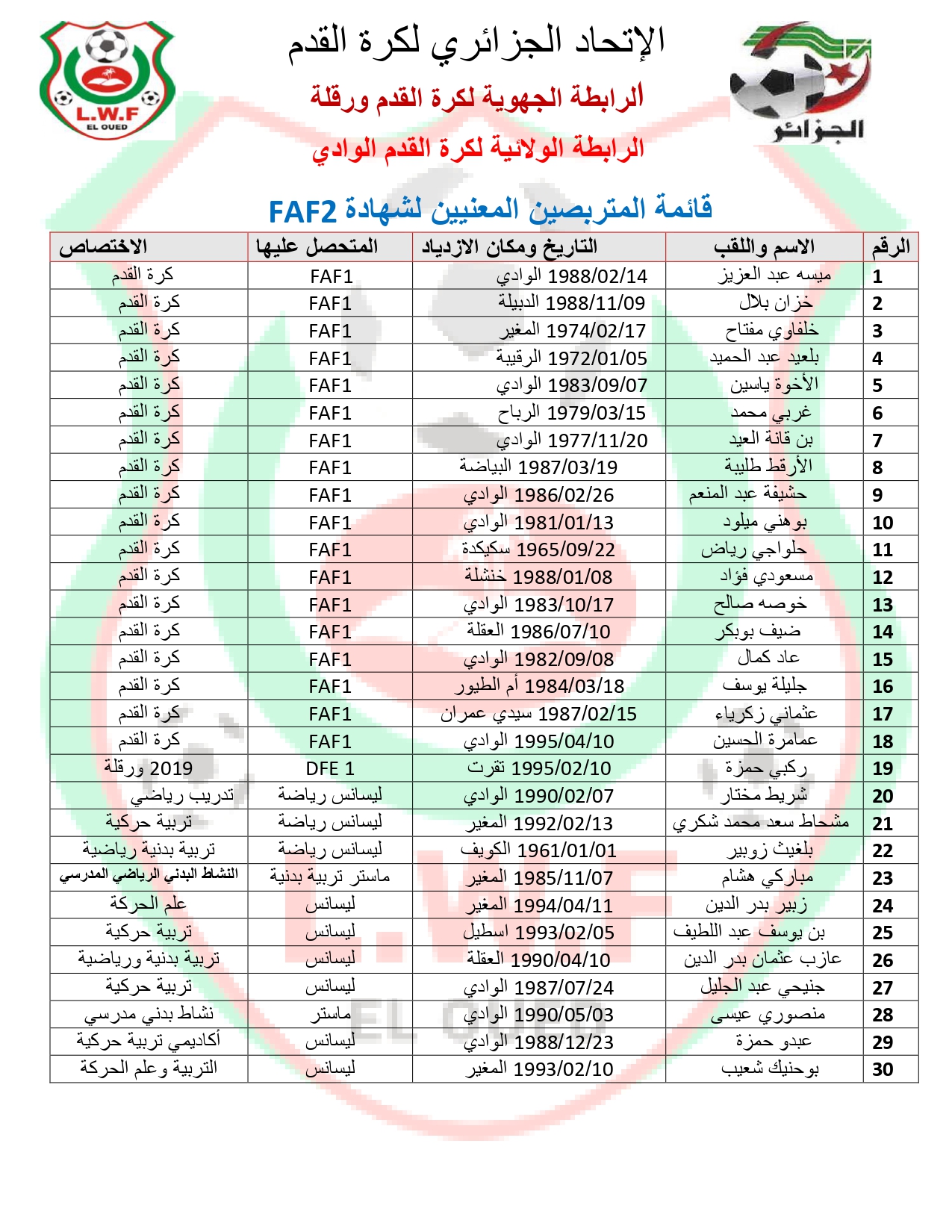 تعلن المديرية الفنية الولائية لكرة القدم بالوادي كافة المدربين المعنيين بهذا التربص(FAF2) إلى تسديد مبلغ المشاركة في اقرب الاجال و تقديم الوصل الى مقر امانة الرابطة الولائية لكرة القدم الوادي