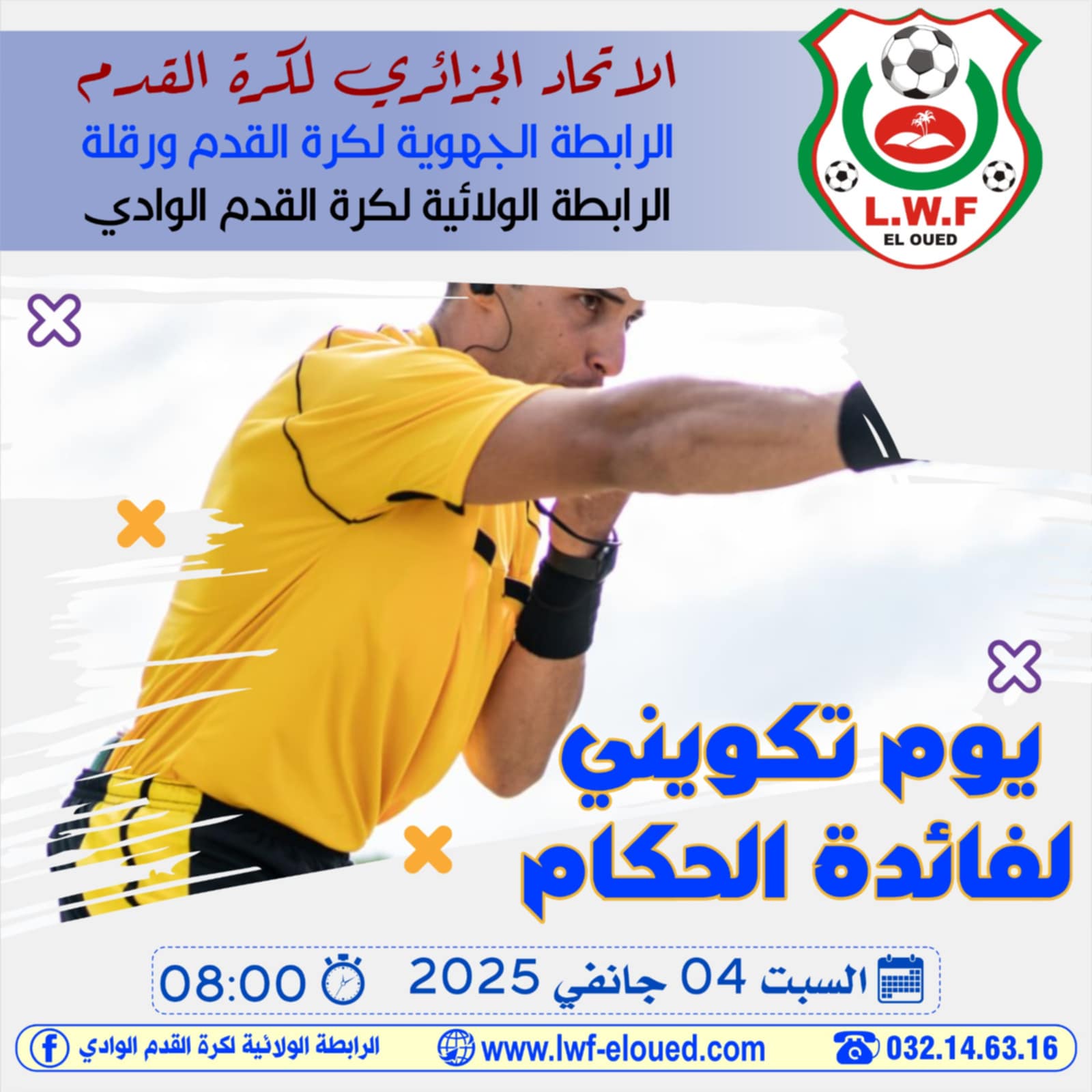 تعلم لجنة التحكيم للرابطة الولائية لكرة القدم الوادي عن برمجة يوم تكويني لفائدة جميع الحكام بمختلف رتبهم وذلك يوم السبت 04 جانفي 2025 بداية من الساعة الثامنة (08:00) صباحا بالمركز الترفيهي العلمي الوادي .
