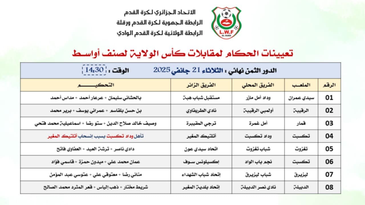 تعلم لجنة التحكيم للرابطة الولائية لكرة القدم عن تعيينات الحكام مقابلات الدور الثمن نهائي من كأس الولاية لصنف الأواسط التي ستجرى يوم الثلاثاء 21 جـــانفي 2025