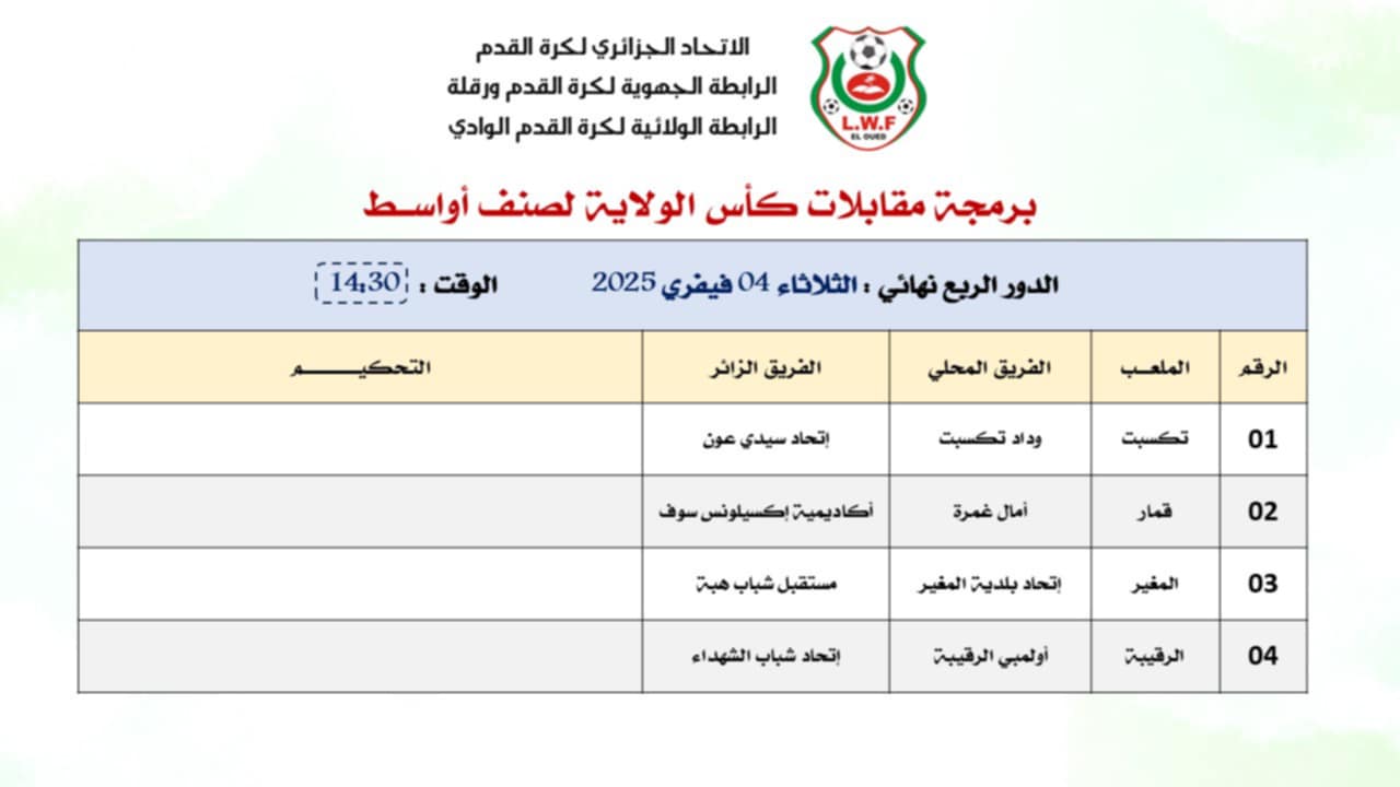 تعلم لجنة المنافسة للرابطة الولائية لكرة القدم عن برمجة الدور ربع نهائي كأس الولا لفئة الأواسط (أقل من 19 سنة ) وذلك يوم الثلاثاء 04 فيفري 2025 على الساعة الثانية والنصف زوالا ( 14:30) .