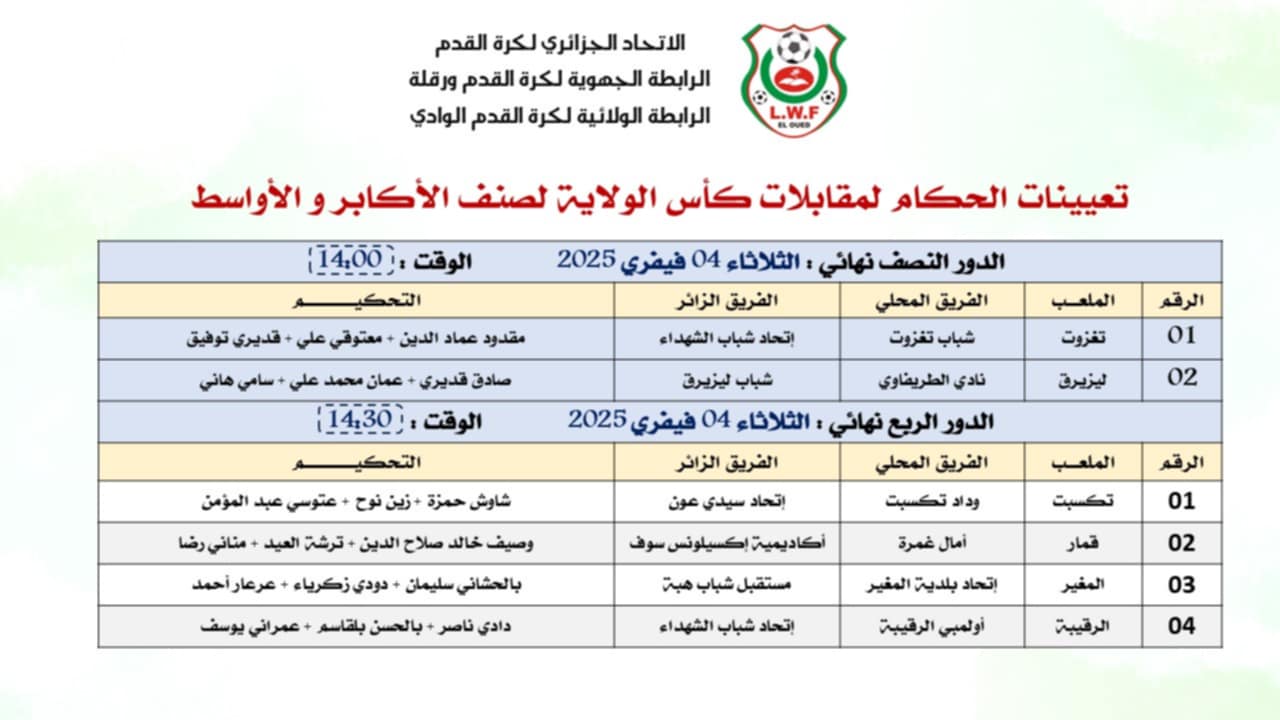 تعلم لجنة التحكيم عن تعيينات الحكام لمقابلات الدور نصف نهائي كأس الولاية لفئة الأكابر و الدور الربع نهائي كأس الولاية لفئة الاواسط (U19) وذلك يوم الثلاثاء 04 فيفري 2025