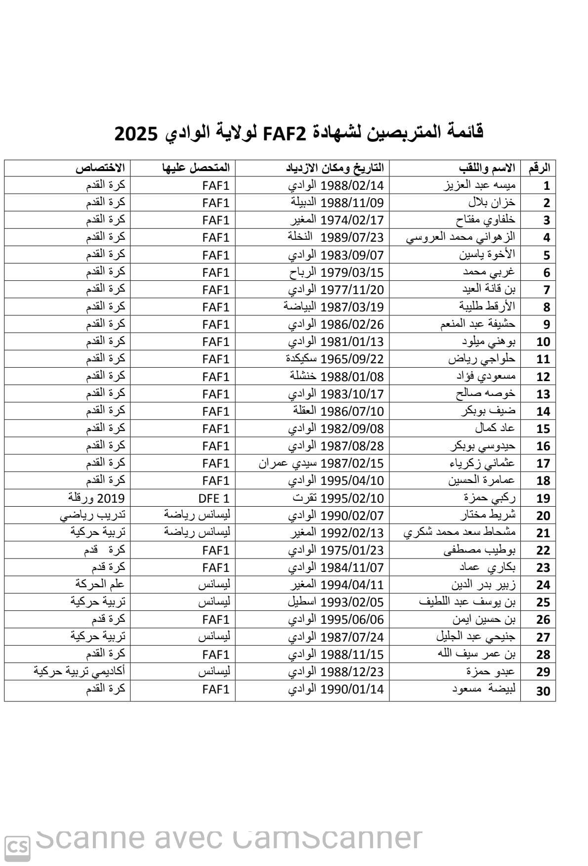 ليكن في علم جميع الاتية اسماؤهم في القائمة ادناه انهم معنيون بتربص FAF2 ابتداء من يوم الخميس 20 فيفري 2025 القادم