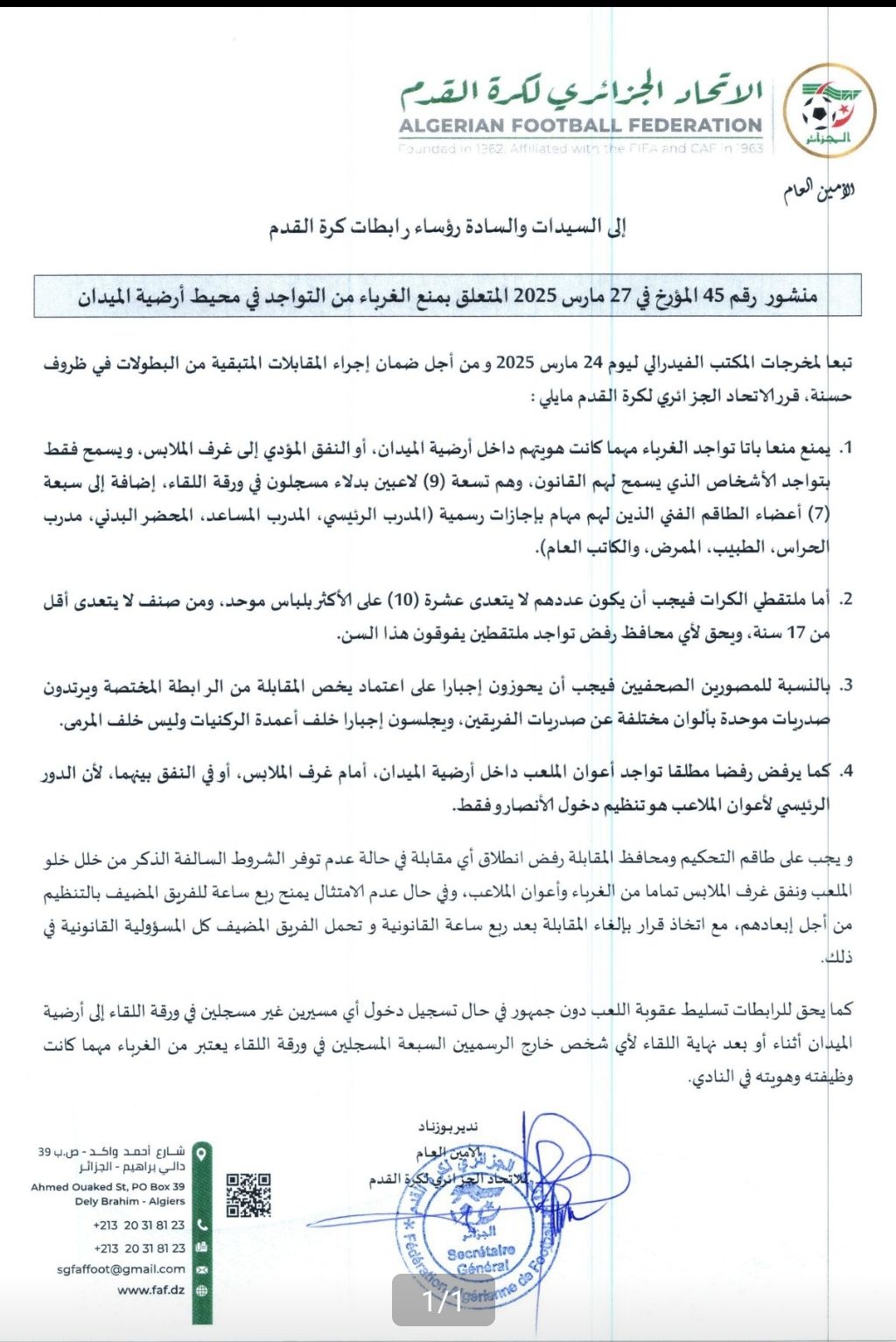 | الأخبارالاتحاد الجزائري لكرة القدم : منشور تعديل تنظيم المباريات داخل الملعب |