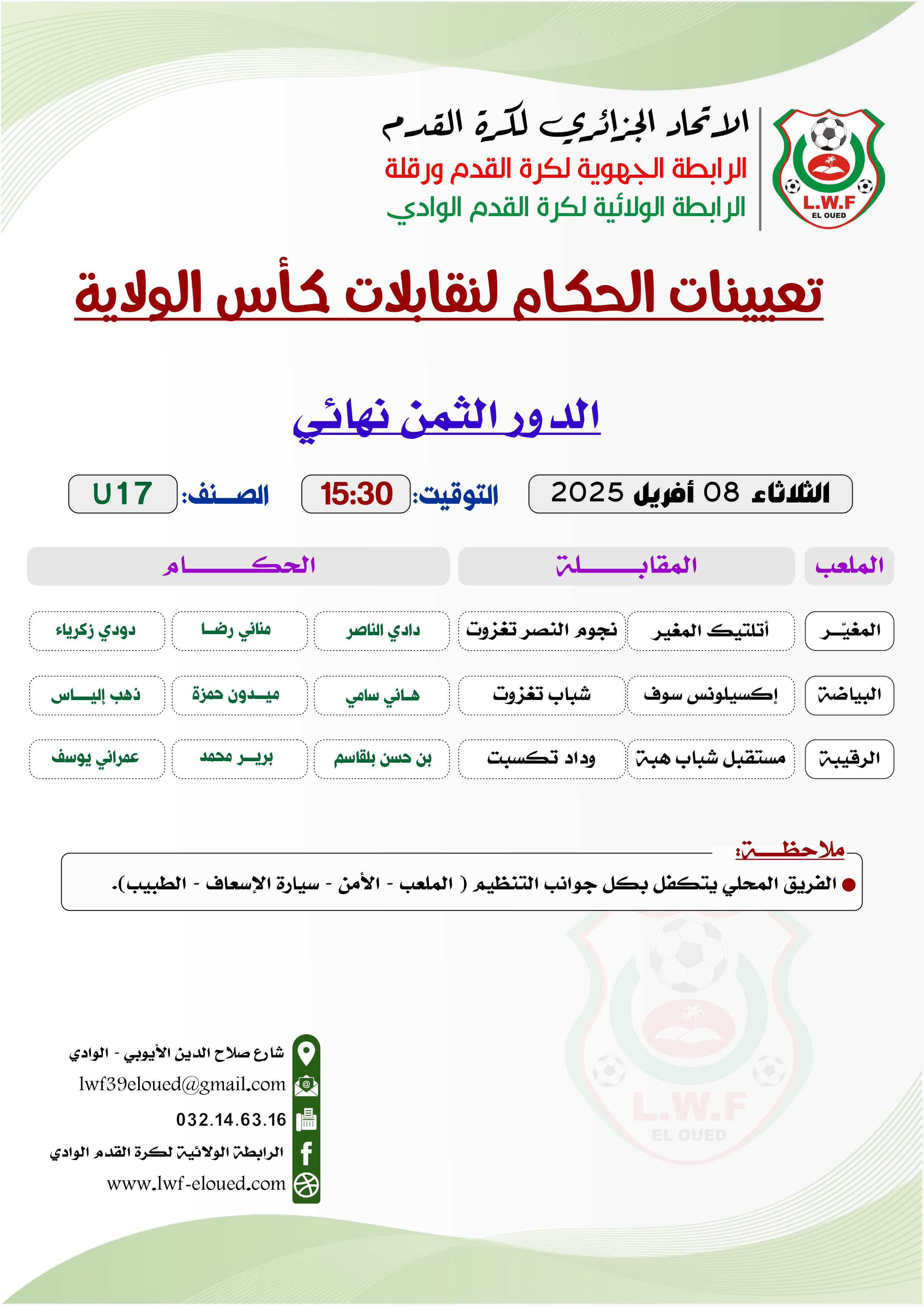 تعلم لجنة التحكيم للرابطة الولائية لكرة القدم عن تعيينات الحكام لمقابلات الدور الثمن نهائي لصنف الأشبال و التي ستجرى يوم الثلاثاء 08 أفريل 2025 .