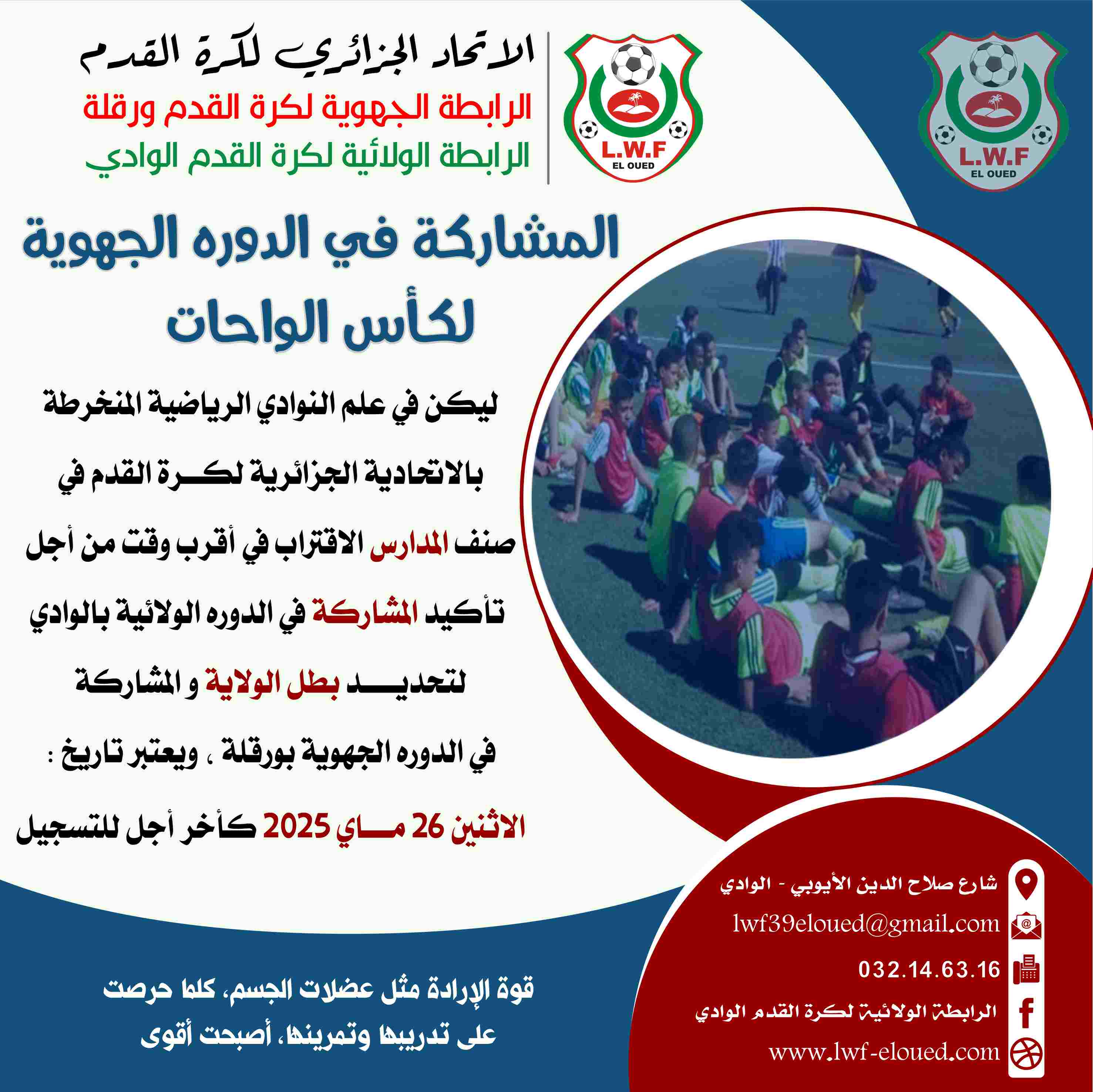 ليكن في علم النوادي الرياضية المنخرطة بالاتحادية الجزائرية لكرة القدم في صنف المدارس الاقتراب في أقرب وقت من أجل تأكيد المشاركة في الدوره الولائية بالوادي لتحديد بطل الولاية و المشاركة في الدوره الجهوية بورقلة .
