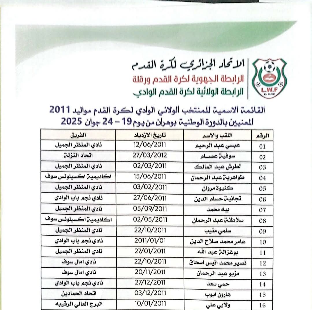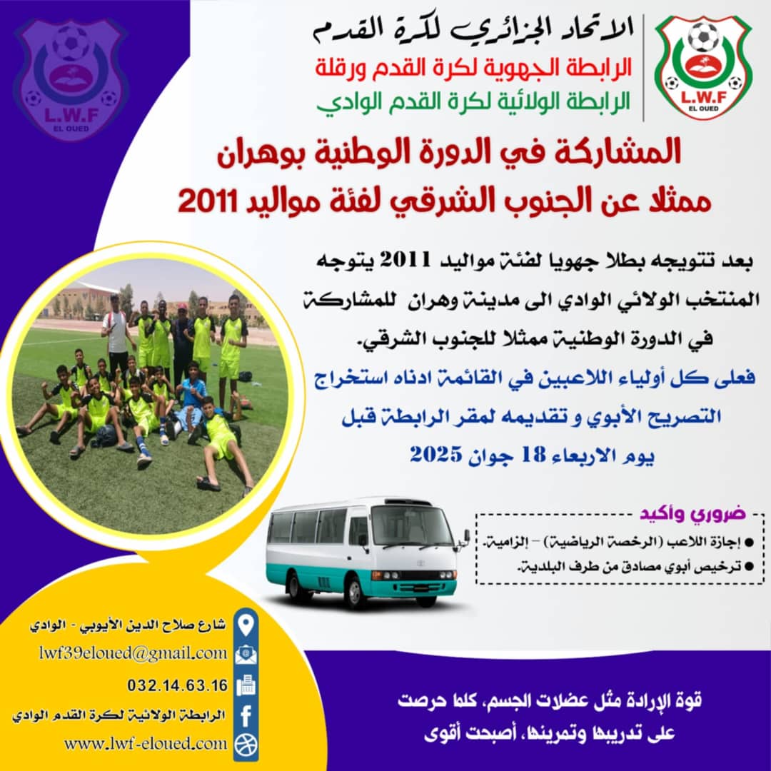 بعد تتويجه بطلا جهويا لفئة مواليد 2011 يتوجه المنتخب الولائي الوادي الى مدينة وهران للمشاركة في الدورة الوطنية ممثلا للجنوب الشرقي.