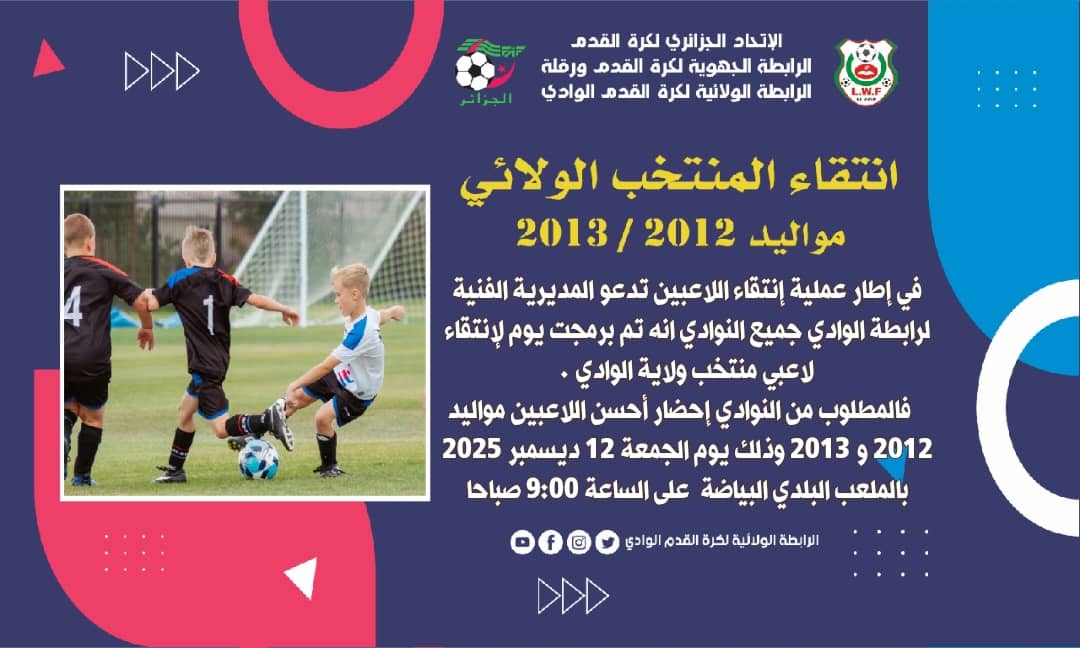 في إطار عملية إنتقاء اللاعبين تدعو المديرية الفنية لرابطة الوادي جميع النوادي انه تم برمجت يوم لإنتقاء لاعبي منتخب الولاية .