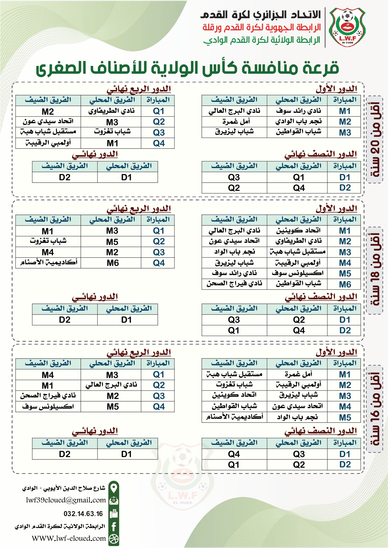خلال الاجتماع الدوري لمكتب الرابطة اجريت عملية قرعة كأس الولاية للأصناف الصغرى يوم الثلاثاء الموافق 2025/12/23 و كانت على النحو التالي :