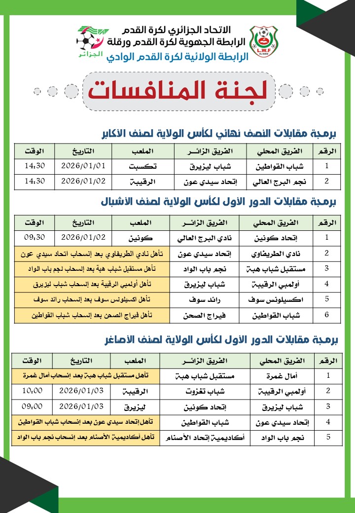 تعلم لجنة المنافسة للرابطة الولائية لكرة القدم عن برمجة الدور نصف نهائي كأس الولاية لفئة الأكابر والدور الأول كأس الولاية لفئة الأشبال والأصاغر وذلك يوم الخميس والجمعة والسبت 01 و02 و 03 جانفي 2026