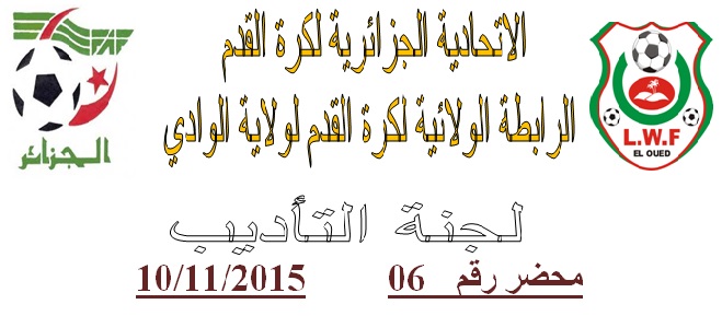 تعلم لجنة الانضباط بالرابطة الولائية لكرة القدم بالوادي  جميع الفرق انها اصدرت المحضر رقم 06  للأطلاع على المحضر  يرجى الضغط على:  النشرة الرسمية  لجنة الأنضباط