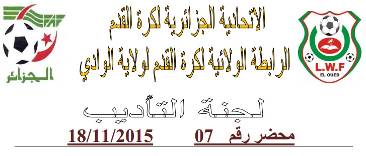 تعلم لجنة الانضباط بالرابطة الولائية لكرة القدم بالوادي  جميع الفرق انها اصدرت المحضر رقم 07  للأطلاع على المحضر  يرجى الضغط على:  النشرة الرسمية  لجنة الأنضباط