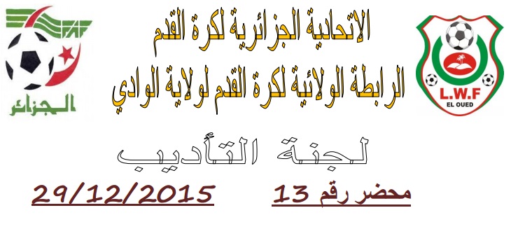 تعلم لجنة الانضباط بالرابطة الولائية لكرة القدم بالوادي  جميع الفرق انها اصدرت المحضر رقم 13  للأطلاع على المحضر  يرجى الضغط على:  النشرة الرسمية  لجنة الأنضباط