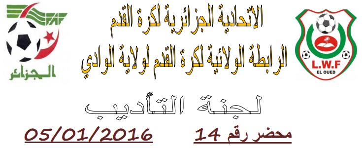 تعلم لجنة الانضباط بالرابطة الولائية لكرة القدم بالوادي جميع الفرق انها اصدرت المحضر رقم 14 للأطلاع على المحضر يرجى الضغط على: النشرة الرسمية لجنة الأنضباط