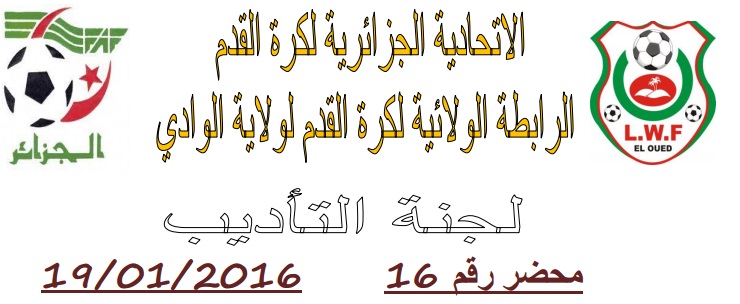 تعلم لجنة الانضباط بالرابطة الولائية لكرة القدم بالوادي  جميع الفرق انها اصدرت المحضر رقم 16  للأطلاع على المحضر  يرجى الضغط على:  النشرة الرسمية  لجنة الأنضباط