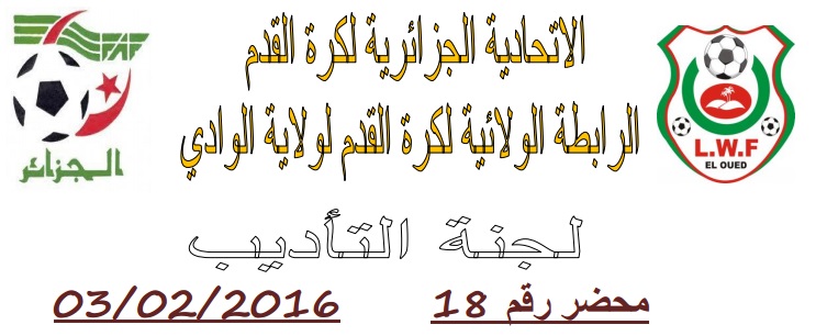 تعلم لجنة الانضباط بالرابطة الولائية لكرة القدم بالوادي  جميع الفرق انها اصدرت المحضر رقم 18 للأطلاع على المحضر  يرجى الضغط على:  النشرة الرسمية  لجنة الأنضباط