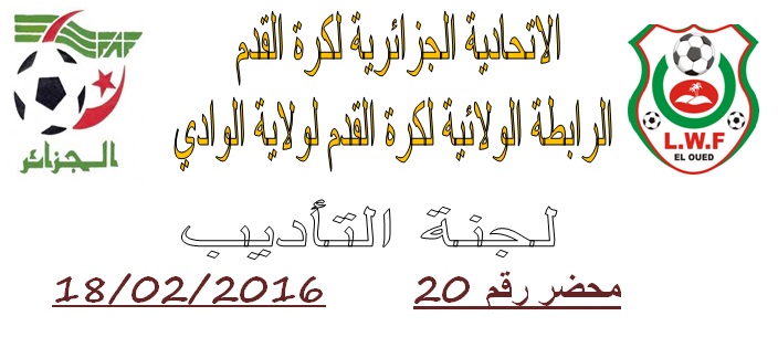 تعلم لجنة الانضباط بالرابطة الولائية لكرة القدم بالوادي جميع الفرق انها اصدرت المحضر رقم 20 للأطلاع على المحضر يرجى الضغط على: النشرة الرسمية لجنة الأنضباط