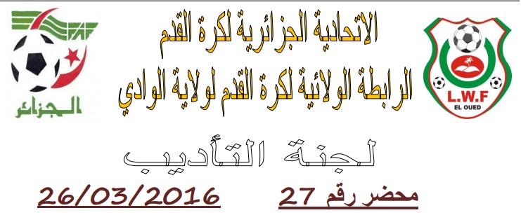 تعلم لجنة الانضباط بالرابطة الولائية لكرة القدم بالوادي جميع الفرق انها اصدرت المحضر رقم 27 للأطلاع على المحضر يرجى الضغط على: النشرة الرسمية لجنة الأنضباط
