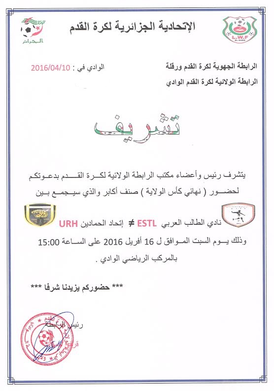 يتشرف رئيس وأعضاء مكتب الرابطة الولائية لكرة القدم بدعوتكم لحضور نهائي كأس الولاية صنف أكابر والذي سيجمع بين : نادي الطالب العربي = اتحاد الحمادين وذلك يوم السبت الموافق لـ : 16 أفريل 2016 على الساعة الثالثة مساء بالمركب الرياضي بالشط والدعوة عامة