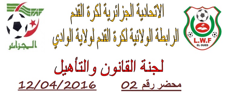 تعلم لجنة القانون والتأهيل بالرابطة الولائية لكرة القدم بالوادي جميع الفرق انها اصدرت المحضر رقم 02 الذي يتضمن قضية نادي ترجي تقددين ونادي اتحاد النزلة اكابر للأطلاع على المحضر يرجى الضغط على: النشرة الرسمية لجنة القانون والتأهيل