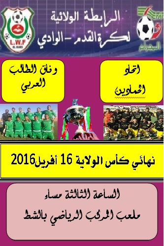 يرتقب الجمهور السوفي هذا السبت مقابلة مثيرة بين فريقين عريقين وفاق الطالب العربي واتحاد الحمادين في إطار نهائي كأس ولاية الوادي إبتداء من الساعة الثالة مساء بالمركب الرياضي بالشط تحت إدرة ثلاثي