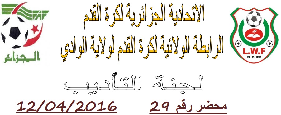 تعلم لجنة الانضباط بالرابطة الولائية لكرة القدم بالوادي جميع الفرق انها اصدرت المحضر رقم 29 للأطلاع على المحضر يرجى الضغط على: النشرة الرسمية لجنة الأنضباط