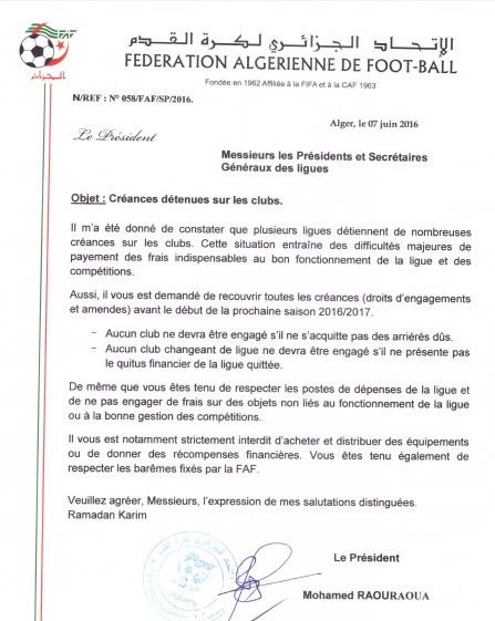 تطبيقا لمراسلة الأتحاد الجزائري لكرة القدم رقم 58 المؤرخة في 07 جوان 2016 والتي جاء فيها :