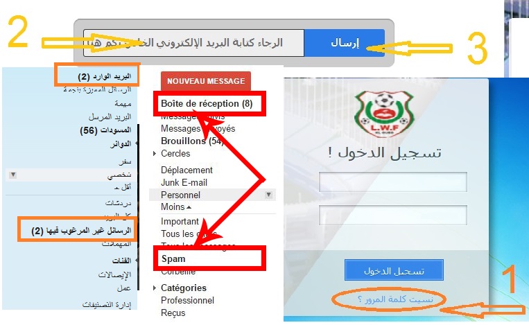 ملاحظة هامة : في البريد الإلكتروني الخاص بكم ستجدون الرسالة في البريد الوارد (Boite de réception) أو الرسائل المزعجة (Spam)، كما هو موضح في الصورة.
