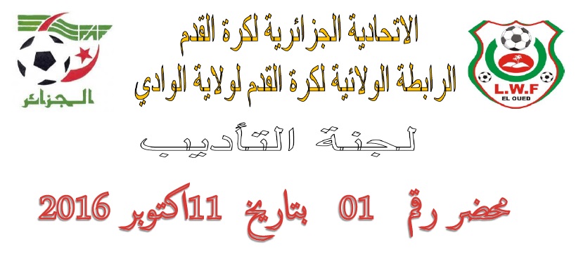 تعلم لجنة الانضباط بالرابطة الولائية لكرة القدم بالوادي جميع الفرق انها اصدرت المحضر رقم 01 للأطلاع على المحضر يرجى الضغط على: النشرة الرسمية لجنة الأنضباط