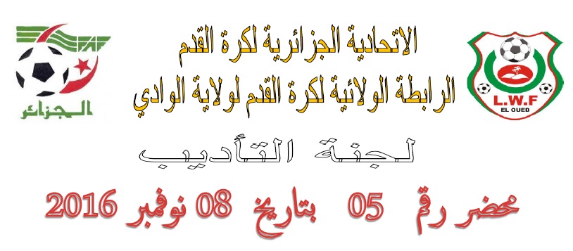 تعلم لجنة الانضباط بالرابطة الولائية لكرة القدم بالوادي جميع الفرق انها اصدرت المحضر رقم 05 للأطلاع على المحضر يرجى الضغط على: النشرة الرسمية لجنة الأنضباط