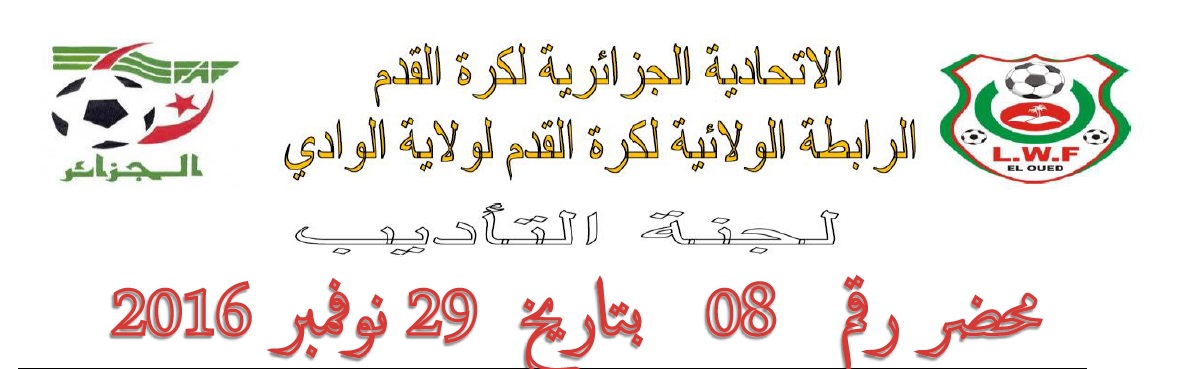 تعلم لجنة الانضباط بالرابطة الولائية لكرة القدم بالوادي جميع الفرق انها اصدرت المحضر رقم 08 للأطلاع على المحضر يرجى الضغط على: النشرة الرسمية لجنة الأنضباط