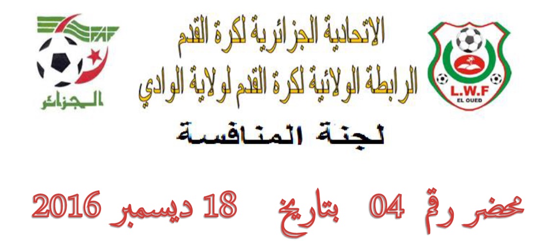 تعلم لجنة المنافسة بالرابطة الولائية لكرة القدم بالوادي جميع الفرق انها اصدرت المحضر رقم 04 للأطلاع على المحضر يرجى الضغط على: النشرة الرسمية لجنة تنظيم المنافسة
