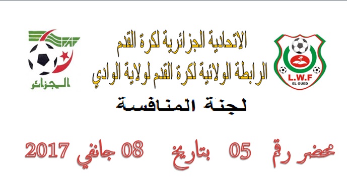 تعلم لجنة المنافسة بالرابطة الولائية لكرة القدم بالوادي جميع الفرق انها اصدرت المحضر رقم 05 للأطلاع على المحضر يرجى الضغط على: النشرة الرسمية لجنة تنظيم المنافسة