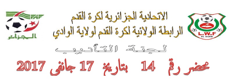 تعلم لجنة الانضباط بالرابطة الولائية لكرة القدم بالوادي  جميع الفرق انها اصدرت المحضر رقم   14 للأطلاع على المحضر  يرجى الضغط على:  النشرة الرسمية  لجنة الأنضباط