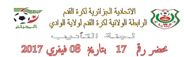 تعلم لجنة الانضباط بالرابطة الولائية لكرة القدم بالوادي  جميع الفرق انها اصدرت المحضر رقم   17 للأطلاع على المحضر  يرجى الضغط على:  النشرة الرسمية  لجنة الأنضباط