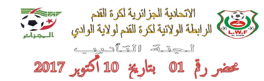 تعلم لجنة الانضباط بالرابطة الولائية لكرة القدم بالوادي  جميع الفرق انها اصدرت المحضر رقم   01  للأطلاع على المحضر يرجى الضغط على:  النشرة الرسمية  لجنة الأنضباط