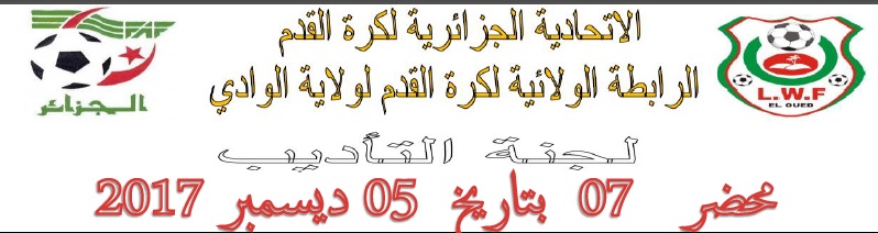 تعلم لجنة الانضباط بالرابطة الولائية لكرة القدم بالوادي جميع الفرق انها اصدرت المحضر رقم 07 للأطلاع على المحضر يرجى الضغط على: النشرة الرسمية لجنة الأنضباط